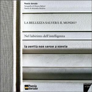 La Poesia Dorsale è un “esperimento” fotografico-letterario nato da una idea di Silvano Belloni (fotografie) e Antonella Ottolina (poesie). Ogni singola poesia è stata costruita utilizzando i titoli che appaiono sui dorsi di svariati libri, ognuno dei quali – messo l’uno sotto l’altro – rappresenta un verso. Una idea originale che emana bellezza. Ma, come si chiedono gli autori, “La bellezza salvera il mondo? Nel labirinto dell’ intelligenza la verita’ non serve a niente”.
