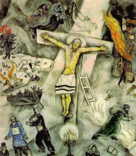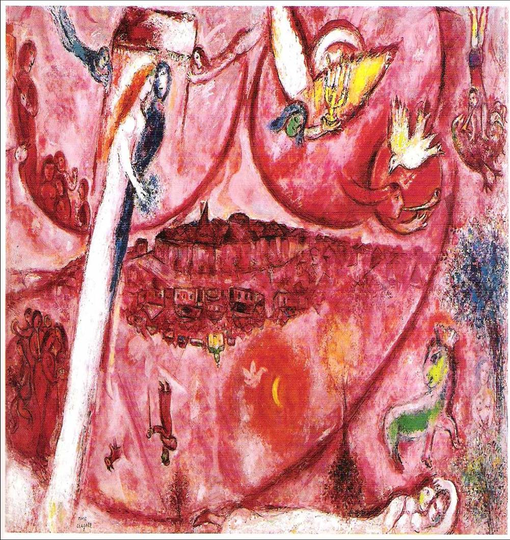 Chagall, aderì al gusto per le forme del Cubismo personalizzandolo e interiorizzandolo fino ad arricchirlo di visioni fantastiche, surreali e mistiche, derivanti dalla sperimentazione diretta del malessere di un’epoca che lo portò a vivere la Rivoluzione Sovietica e l’esperienza della persecuzione nazista. A Chagall la capacità di penetrare la spiritualità rivivendola e ripercorrendola simbolicamente fino a dar voce alla sofferenza e significato al dolore, quasi a voler dire, dissacrando-sacralmente, che la malvagità, tipicamente umana, sovrasta qualunque credo religioso, qualunque fede.