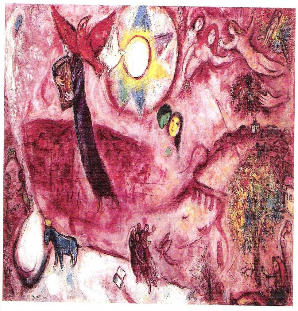 Nel Cantico dei Cantici, invece, Chagall sembra fondere l’attenzione del Surrealismo – di cui nella sua opera di maturazione e superamento/interiorizzazione del Cubismo, può considerarsi a pieno titolo precursore – per l’Eros con la tradizione mistica dell’Agape in un unicum d’amore ascendente e discendente, che rapisce al di là della potenza espressiva dei versi, ad essi plasmandosi magicamente: