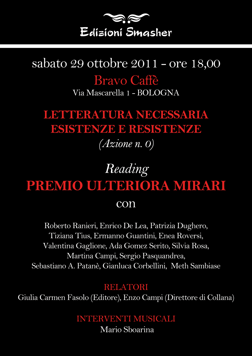 Lo scopo del progetto è essenzialmente quello di far CIRCOLARE i libri e le cosiddette “risorse umane” creando dei momenti di aggregazione, scambio e confronto che possano abbattere qualsiasi tipo di divisione ideologica, editoriale, di mercato, ecc., mettendo in comunicazione tra loro diverse e svariate realtà che operano nel settore o che sono impegnate in tal senso. Quello che conta qui è una vera e propria “messa al lavoro” della letteratura. Semplificando e riducendo, si potrebbe dire che se le “esistenze” sono riconducibili ai libri, in quanto oggetti fisici, le “resistenze” rappresentano le “azioni” di quei “soggetti” fisici che producono i libri. Aggiungendo una sola caratterizzazione: il fatto di ostinarsi, per esempio, a produrre e a “spacciare” poesia, oggi come oggi, deve essere considerato come un vero e proprio “atto politico”. In tal senso ogni azione di questo tipo viene a rivestirsi di un plusvalore sociale. “Letteratura necessaria” è un progetto che vuole rendersi pratico, concreto e tangibile. Qui si tratta di far sì che la necessità di mettersi in gioco in prima persona diventi l’aspetto preponderante della diffusione della letteratura come atto corporeo, politico e aggregativo. L’idea di fondo è quella di ovviare alla sempre più imperante DISPERSIONE che caratterizza, in negativo, l’attuale panorama letterario nazionale e di creare una sorta di rete che permetta la costituzione e la ripetizione di eventi collegati tra loro ove far interagire realtà letterarie e realtà editoriali, in un regime non competitivo, ma collaborativo. “Letteratura necessaria”, beninteso, non vuole essere un movimento tematico, ma pluritematico, volto a certificare la propria “esistenza” e a diffondere una sorta di “resistenza”. Resistenza a chi e a cosa? A tutto ciò che è privazione, restrizione, negazione, omologazione, ghettizzazione, a tutto ciò che lede i propri diritti, che ripropone gli stessi, triti e ritriti canoni letterari. In poche parole il progetto, almeno in fase concettuale, nasce “in costruzione” e crescerà sempre “in costruzione”, assorbendo e consolidando, di volta in volta, necessità, urgenze, tematiche e facendosi portavoce di messaggi che possano rientrare nei concetti di necessarietà, esistenza e resistenza. (Enzo Campi – Reggio Emilia – Settembre 2011)