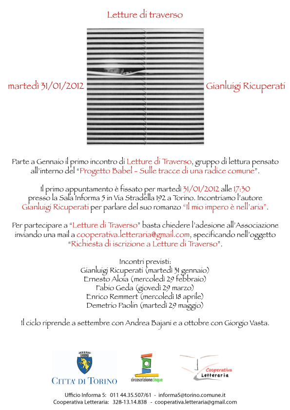 È dedicato a Il mio impero è nell’aria di Gianluigi Ricuperati il primo appuntamento di Letture di Traverso, gruppo di lettura realizzato dall’Associazione Cooperativa Letteraria all’interno del “Progetto Babel – Sulle tracce di una radice comune”.