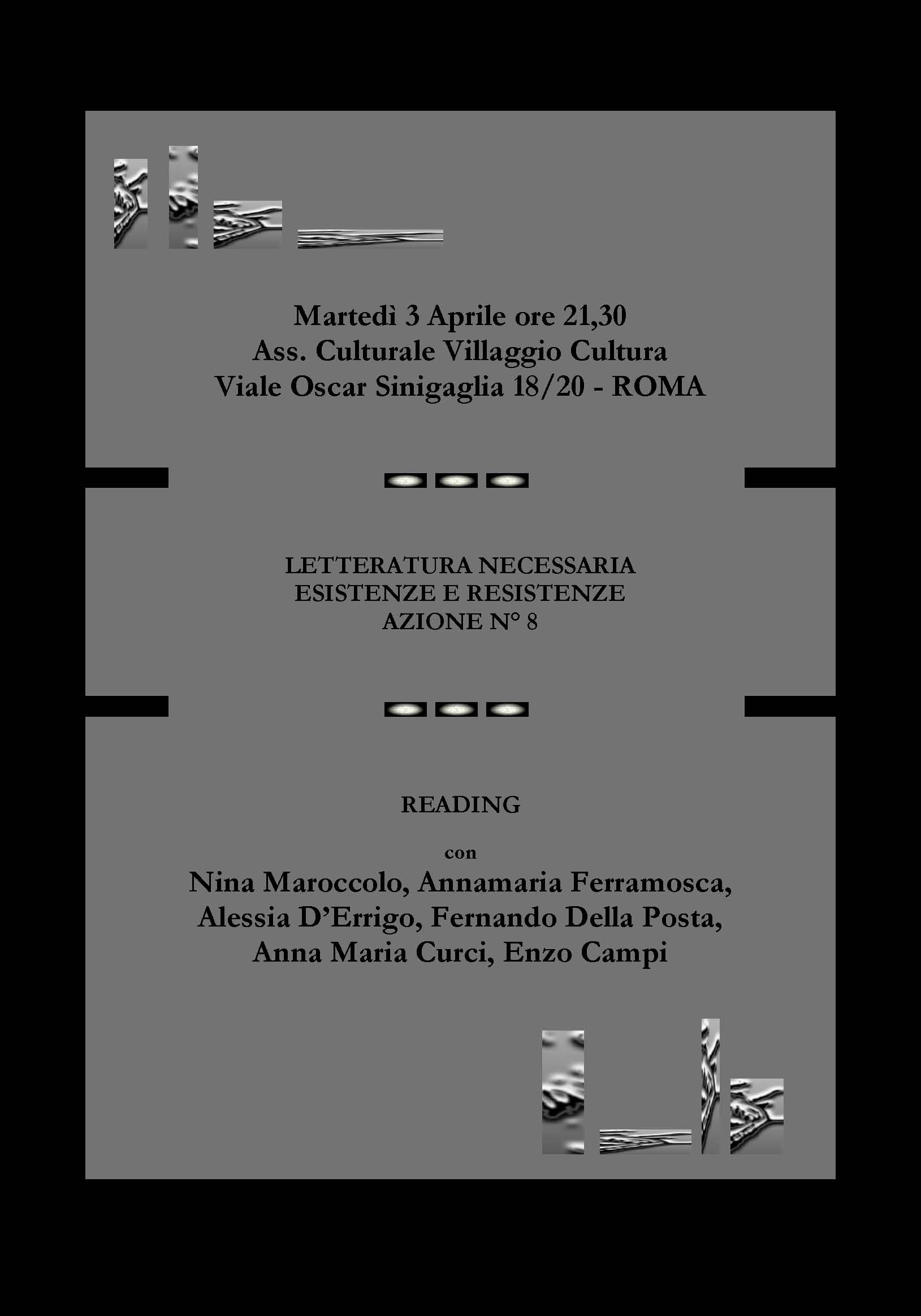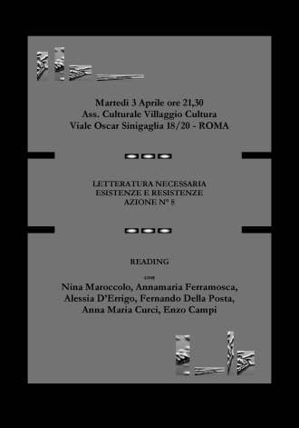 Quello che conta qui è una vera e propria “messa al lavoro” della letteratura. Semplificando e riducendo, si potrebbe dire che se le “esistenze” sono riconducibili ai libri, in quanto oggetti fisici, le “resistenze” rappresentano le “azioni” di quei “soggetti” fisici che producono i libri. Aggiungendo una sola caratterizzazione: il fatto di ostinarsi, per esempio, a produrre e a “spacciare” poesia, oggi come oggi, deve essere considerato come un vero e proprio “atto politico”. In tal senso ogni azione di questo tipo viene a rivestirsi di un plusvalore sociale. “Letteratura necessaria” è un progetto che vuole rendersi pratico, concreto e tangibile. Qui si tratta di far sì che la necessità di mettersi in gioco in prima persona diventi l’aspetto preponderante della diffusione della letteratura come atto corporeo, politico e aggregativo. L’idea di fondo è quella di ovviare alla sempre più imperante DISPERSIONE che caratterizza, in negativo, l’attuale panorama letterario nazionale e di creare una sorta di rete che permetta la costituzione e la ripetizione di eventi (“marchiati” e catalogati progressivamente in “azioni”) collegati tra loro ove far interagire realtà letterarie e realtà editoriali, in un regime non competitivo, ma collaborativo.