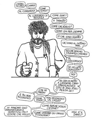 L’impatto della parola pronunciata, del segno tracciato per la prima volta. È stata solo un’illusione, questa, contro la quale la mia generazione si è schiantata più o meno ingloriosamente? Qui mi preme piuttosto manifestare il nitore della visione, la sua forza profetica – la vignetta del 1979 scelta come immagine di questa quinta tappa ne è una dimostrazione evidente – a dispetto di tutte le accuse di disumana durezza. Prima volta, sì, ma con la sapienza di chi ha letto, ha osservato, ha ascoltato, ne ha fatto tesoro, di chi non ha timori reverenziali, ma neanche la memoria a maglie larghe. Rileggere le tavole di Zanardi – anche ora, proprio ora che sono nella prospettiva ‘altra’ rispetto alla cattedra – e cogliere il guizzo di chi sa oltrepassare in fecondo cinismo il Franti di Cuore, pur elogiato da Umberto Eco, è una cosa sola. Bene fa Lea Durante ad affermare nel capitolo dedicato ad Andrea Pazienza nella sezione La scrittura narrativa in Capitanata del volume Letteratura del Novecento in Puglia: «L’ambiente della scuola diventa ancora una volta occasione di lavoro sulla lingua, di creazione di parole» (p. 142). Prima volta, sì, ma con la pazienza di chi sa aspettare “la preda più ambita”, pronto a disegnarla se esce dall’acqua. Un’immagine, quest’ultima, che l’amico Stefano Benni sceglie per Andrea Pazienza nel suo racconto Paz e la carpa Nan Ch’ai, pubblicato per la prima volta sulla rivista «Il Grifo». Del racconto ho scelto di riportare la prima parte: