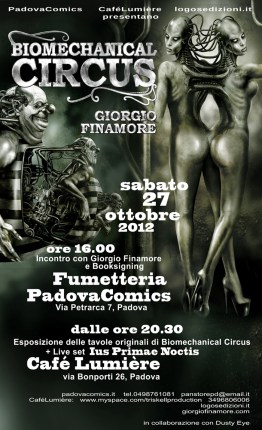 Innanzitutto preciso che la mostra serale presso il Café Lumière a Padova, è anticipata da un incontro di presentazione del libro, dalle ore 16 di Sabato 27 Ottobre, presso la fumetteria PadovaComics (in via Petrarca), dove sarò disponibile per firmare e disegnare sui volumi. Il Café Lumière è una viva realtà artistica padovana, oltre che un bar in centro a Padova. Da diversi anni si organizzano mostre ed eventi. Io ho fatto una mostra lì qualche anno fa dal titolo “Robotapocalypse”, dove ho presentato una selezione di lavori realizzati nell’arco di circa un decennio, visionabili sul mio sito. Con questa Mostra presenterò al pubblico le opere originali di diverso formato pubblicate nel libro. Dato che si parlava di musiche per “Biomechanical Circus”, ti dico anche che la Mostra al Lumière sarà accompagnata da un live set del gruppo electro psichedelico Ius Primae Noctis.