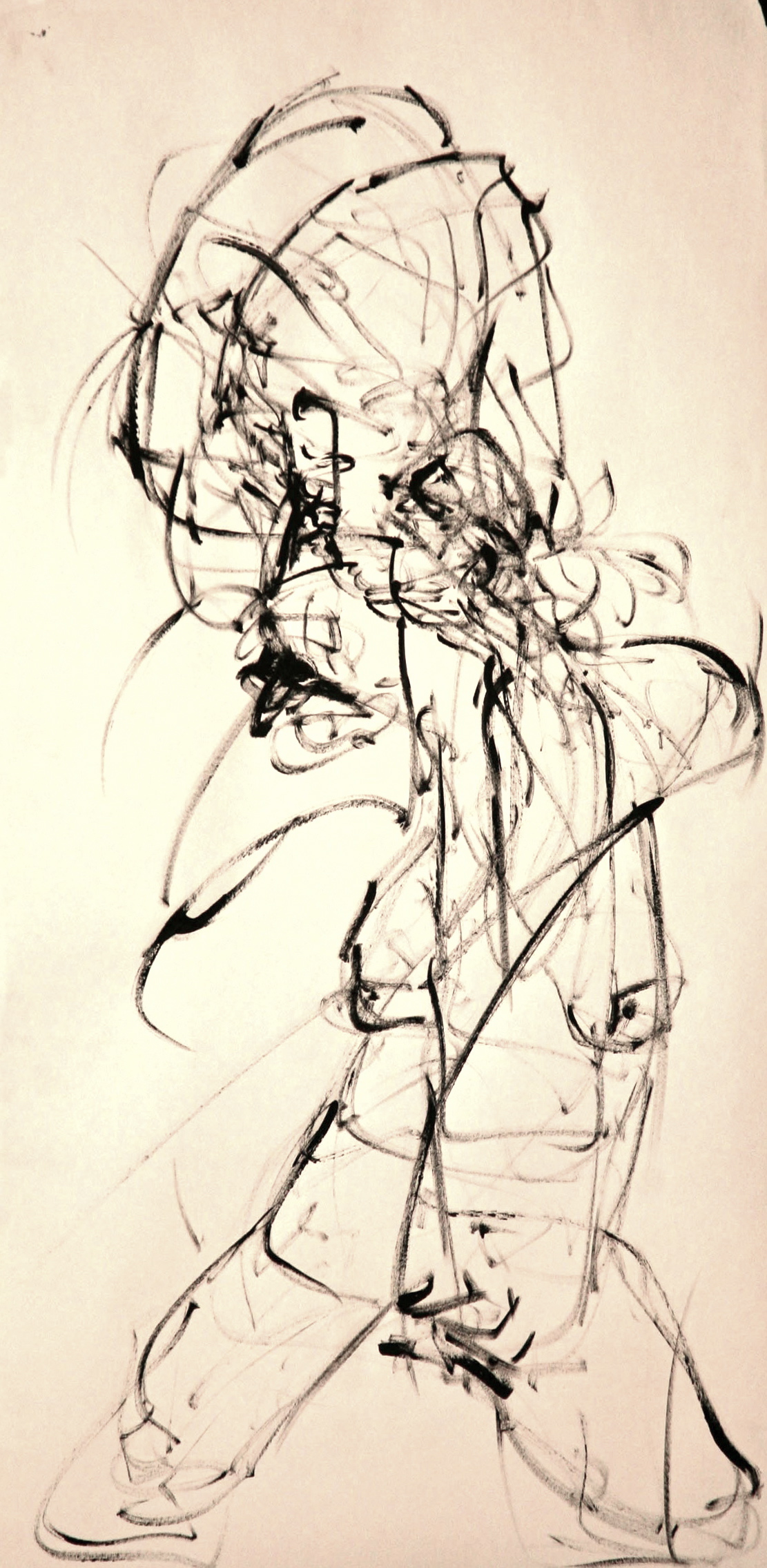 Passo ai disegni. I volti, le camminate, le piroette sono in dialogo con i testi di Genet, negli occhi sbigottiti come nelle pose morbide. Il rimbalzo schiude. Basta uno sguardo alla propria sinistra, osservando La strage della mia innocenza, perché le parole di Genet inchiodino al suo senso l’esperienza dell’intera mostra: «La Morte – la Morte di cui ti parlo – non è quella che seguirà la tua caduta, ma quella che precede la tua apparizione sul filo». È quando la mente spia quelle parole che una chiave ci si posa nella tasca, e si ha l’impressione di afferrare l’attimo in cui quei volti, quelle occhiate, quei movimenti, si sono imposti con chiarezza prima di diventare gesto, ogni tratto – anche il più automatico e furioso – sufficiente e necessario a comunicarne la posa e l’espressione. Che diventano, per un’empatia quasi involontaria, la posa e l’espressione di chi guarda.