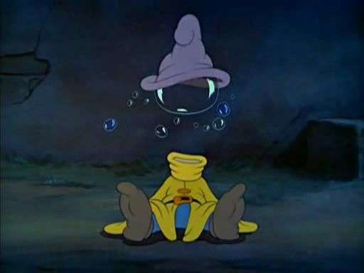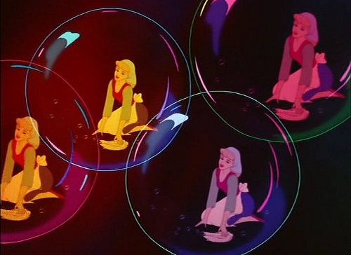 Altro rapporto difficile con la figura materna è quello di Cenerentola (1950), che –nella trasformazione da sguattera a principessa– passa attraverso due scene di abluzione: lavata prima dagli uccellini (!), si specchia poi nelle bolle di sapone aggiustandosi i capelli. È curioso che l’atto supremo di vanità –guardarsi riflessa– avvenga durante l’espletamento delle faccende domestiche, che restano l’incubo della Disney come, del resto, di Natalia Ginzburg (Mai devi domandarmi, 1970). Vanitoso, infatti, è anche l’apprendista stregone Topolino (Fantasia, 1940) che dovrebbe lavare il pavimento e invece rischia di annegare a causa delle inarrestabili scope incantate, che causeranno danni persino alla Bella addormentata (1959).