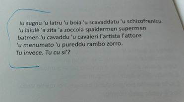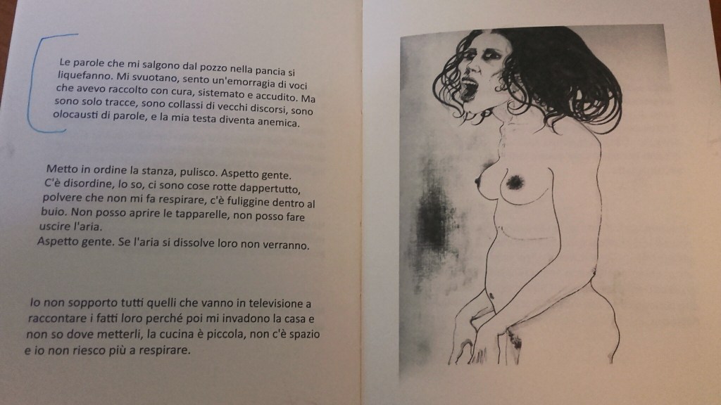 Si intuisce che per ottenere questo risultato formale e di contenuti bisogna prima fare un lungo lavoro di ricerca, cosa che Anna Pavone ha fatto. Pavone ha preso taccuini e treni per andare nelle case di cura a parlare con i medici e ad ascoltare le parole dei malati mentali. Le parole del disagio. Altre storie le sono state raccontate magari da un parente, magari da un amico. Alcune le ha ascoltate per strada, come quella in siciliano che leggete nell’immagine in alto; a volte il dialetto è di straordinaria efficacia.