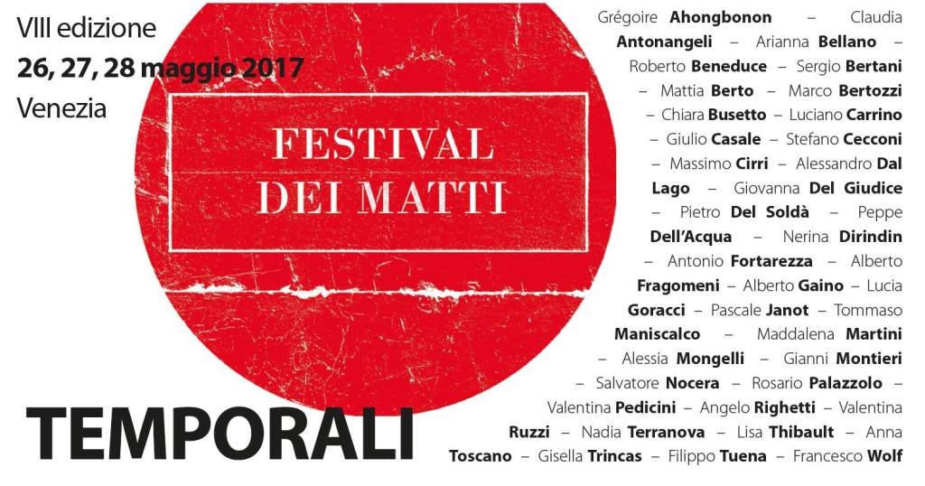Temporali, l’ottava edizione del Festival dei Matti che si svolgerà a Venezia il 26, 27 e 28 maggio 2017, è un invito ad esitare, a far sosta intorno alle parole, ai discorsi, ai gesti che segnano il passo di questo nostro scombinato tempo, sfiancato in gorghi senza attese.