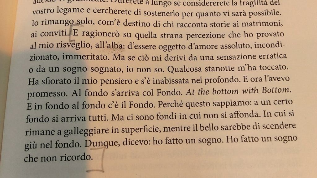 La voce narrante convoca la donna amata, la convoca all’immaginazione e al sogno. La invita a immaginare dalla prima pagina, un palazzo, un giardino, un luogo altro; e la avverte che nella notte in arrivo, una notte di mezza estate, qualcuno arriverà a mettere in scena una rappresentazione privata della commedia di Shakespeare.