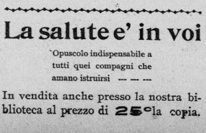 La mattina del 3 maggio del 1920, Andrea Salsedo, tipografo del giornaletto “DOMANI” precipita dal 14° piano del Park Row Building, l’edificio che ospita il dipartimento di giustizia di Manhattan. Salsedo era stato arrestato da qualche giorno con il collega Roberto Elia in seguito agli attentati che un anno prima avevano preso di mira personaggi legati alla soppressione della rivista settimanale “Cronaca sovversiva” di Luigi Galleani e a cui collaboravano oltre a Salsedo anche Nicola Sacco e Bartolomeo Vanzetti. Questo fatto, probabilmente sconosciuto ai più, ma riconoscibile nelle dinamiche da molti (non a caso citato da Dario Fo nello spettacolo Morte accidentale di un anarchico), non è solo che il principio di quanto poi avrebbe portato 7 anni dopo Sacco e Vanzetti sulla sedia elettrica. Questi e altri fatti relativi all’arresto e al processo dei due anarchici italiani sono presenti e accuratamente descritti in La salute è in voi, Sacco, Vanzetti e la dimensione anarchica, traduzione degli atti della conferenza tenuta presso la Biblioteca di Boston tra il 26 e il 27 ottobre del 1979 e raccolti poi in un volume da parte dello storico Robert d’Attilio. Questo piccolo volume, auto-prodotto in collaborazione da piccole edizioni indipendenti piemontesi raccoglie non solo la traduzione di cui sopra ma presenta la copia anastatica di quel “La salute è in voi” l’opuscolo clandestino, pubblicato il 5 maggio 1906 all’interno di Cronaca sovversiva e che girava tra i gruppi anarchici italiani dell’epoca.