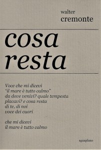 Cosa resta di Walter Cremonte, pubblicato nella collana Lapsus calami dell’editore Aguaplano (Passignano 2018), raccoglie liriche tratte da sillogi composte tra il 2001 e il 2016 cui si aggiungono due inediti. Se si considera la propensione dell’autore a costruire brevi percorsi di scrittura, a volte consegnati a libriccini di poche pagine stampati in proprio e in pochissime copie, non c’è che da rallegrarsi per la pubblicazione di un’antologia che raccoglie e salva dalla “dispersione” una scrittura poetica sempre intensa e profonda, offrendo un saggio significativo dei temi e della cifra stilistica che la caratterizzano, come era già accaduto nel 1999 con il volume antologico Contro la dispersione (Perugia, Guerra Editore) che raccoglieva testi composti nell’arco di circa vent’anni.