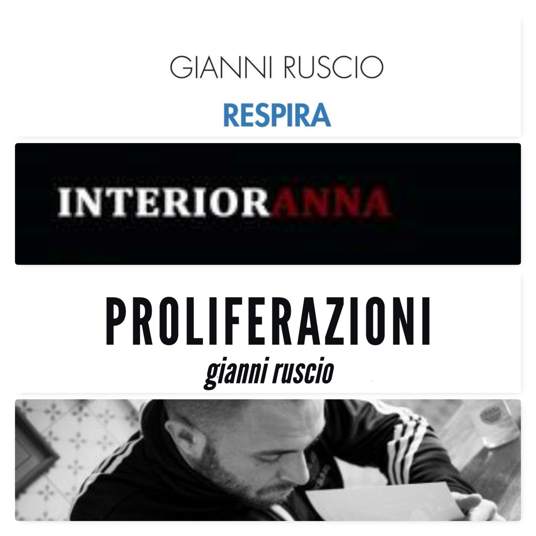 Gli ultimi tre volumi di versi di Gianni Ruscio, Respira (Ensemble 2016), Interioranna (Algra 2017) e Proliferazioni (Eretica 2017) formano una sorta di trilogia, magari inconsapevole, poco importa, nella forma di una storia esaltante e nello stesso tempo angosciosa (intendo per l’autore prima di tutto, e poi naturalmente per chi legge). Perché storia? Perché la dimensione filogenetica generale di un incontro, di un amore folto di sesso, di una gestazione, di una nascita e poi di una famiglia è la storia, con una s così minuscola da risultare appunto esaltante e insieme paurosa.