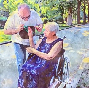 Tornando a casa, arriviamo in piazzetta e, seduti in un angolo all’ombra, troviamo la sua amica Bianca insieme al marito, ognuno con il suo girello. Non si vedono da sette mesi ma, anche se nota il netto peggioramento, la sua amica si comporta come se fosse tutto normale, anche quando mia madre dice che Marco oggi non è con lei.