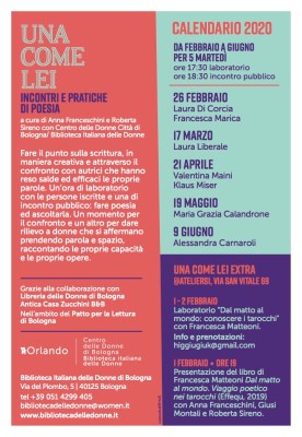 UNA COME LEI incontri e pratiche di poesia è un progetto a cura di Anna Franceschini e Roberta Sireno con Biblioteca Italiana delle Donne di Bologna/Centro delle Donne di Bologna.