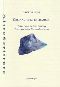 Titolo quanto mai in sintonia con il momento, quello dell’ultimo libro di Lucetta Frisa, che mi permetto di definire la sua prova più convincente ed alta. Mi soffermo sul titolo, quindi: Cronache di estinzioni riunisce due elementi in apparente contraddizione, essendo la cronaca deputata ai fatti di attualità, ma senza profondità storica, mentre è solo su una scala temporale e spaziale molto più ampia che si possono apprezzare le estinzioni. Divaricazione, questa, che si riflette all’interno di una raccolta che sembra avere due centri focali, un Io che riflette sul passare del tempo, sul ricordo e sulla morte, e un mondo che va in sfacelo per le tante cause che tutti conoscono e con i tanti effetti che tutti vedono.