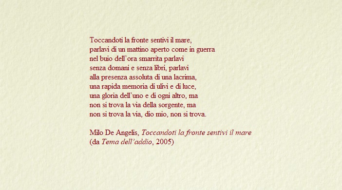 Pensiamo a una città immersa nell’estate, reale e sospesa insieme, che vive tra il caldo e l’asfalto rovente. Può essere Roma o Milano. In prospettiva vediamo già una strada che alita un calore invisibile e mordente. Ma estate e asfalto, oltre a mostrarsi come riferimenti tangibili e chiavi simboliche di un discorso poetico, riecheggiano di un’atmosfera, riportano a un dolore interno che si prolunga, che fugge dalla pagina e si riversa silenziosamente, per proiezione intrapsichica, nelle stesse strade. È un dolore di ospedale dove l’olfatto, a lungo andare, si abitua all’aria chiusa che sa di quell’odore asettico di medicine e flebo e fa ripensare a una poesia di Maurice Maeterlinck intitolata Ospedale: «Ospedale nel mese di luglio!/Si prepara il fuoco nella sala! […] (Che le finestre restino chiuse,/ che nulla, là fuori, ci possa colpire)». È un’aria di serra che serba una memoria vocativa, fiabesca e visionaria, e un tepore annichilente, di fiori malaticci arresi alla stanchezza (Serre calde è il titolo del libro di poesie di Maeterlinck). Eppure, nella consunzione del dolore appena citato – che vuole comunque trattenere qualcosa nel tempo e nell’assenza di qualcuno –, il gesto sintetico per eccellenza, la poesia, polarizza un incontro inevitabile fra vita e morte. La poesia si adopera per parlare di morte sia per tentare quel noto dialogo con le persone amate non più con noi sia per non essere sopraffatti dal pensiero della stessa morte, divenendo, allora, questo atto uno scongiuro per rendersi consapevoli di un’epifania. La raccolta Tema dell’addio di De Angelis tenta proprio la via dello scongiuro, segnando uno dei suoi vertici più importanti, contrassegnato sia sul piano stilistico sia tematico. Il libro, notoriamente dedicato a sua moglie Giovanna Sicari, narra, con struggente ma asciutta malinconia, la malattia e la morte prematura della poetessa. In particolare la terza sezione della raccolta, intitolata Trovare la vena, è indicativo non solo di una via Crucis lucidamente descritta, bensì pure di un’indagine profondamente umanizzante, oltre che sentimentale, in cui la cura medica di trovare la vena svela un’analogia e un’incertezza tremende perché trovare la vena è trovare la vita, il suo senso, la consolazione. La vena è la via, la direzione che conduce a qualcosa e a comprendere quel qualcosa, reso nella trasfigurazione delle vicende umane e della propria identità nel mondo. La vena è «anche quella astratta, poetica» (Annelisa Alleva), la poesia che cerca di capire e penetrare il dolore, osservarlo per, ancora una volta, oggettivarlo con un atto di seppur drammatica riflessione. Cosa succede quando non si trova la vena, la sorgente, anzi «lo zampillo» senza dimenticare Maeterlinck? La situazione precipita, tutto si capovolge. Si prefigura la notte sul volto amato, il silenzio, il momento di un preannunciato distacco. Allora il tema dell’addio, sottolinea Giuseppe Genna, «non è la morte: è la proiezione del distacco». La riflessione di Tema dell’addio ci dice questo: quanto è sicuro nel nostro vivere è la perdita e il fatto di dover imparare a gestirla per capire come viverla.