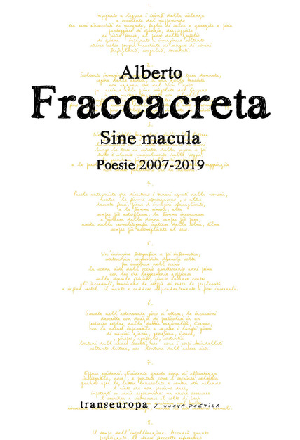 È uno spirito vivo, capace di trascinare in una tensione rivolta al futuro quello che, con forza ineludibile, si libera dalle pagine dell’ultimo libro di Alberto Fraccacreta: con Sine macula (Transeuropa, pp. 213, € 20) l’autore riunisce la sua opera edita e inedita (ma non omnia, precisa) in nuovo e ampio formato, stringendo ciascun capitolo con l’altro nel segno di Delia. Riallacciandosi alla tradizione del personaggio allegorico femminile, Fraccacreta propone sotto il nome di Delia un carico d’incremento significativo: le due raccolte autonome Uscire dalle mura e Basso Impero – già edite entrambe per Raffaelli, rispettivamente nel 2012 e nel 2016 – trovano ora collocazione in un percorso di senso ulteriore.