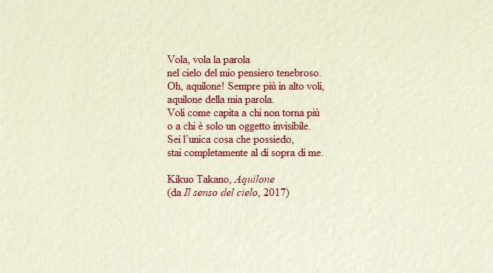 Talvolta la poesia nasce da un dolore e continua la sua esistenza con una domanda e quella domanda, pur svincolata dal dolore stesso, non dimentica il punto da cui si è originata. Si può sintetizzare così la poetica di Kikuo Takano, matematico giapponese, poeta fra due mondi, due ispirazioni, per lui due imprescindibili lezioni: l’Oriente e l’Occidente, rappresentati simbolicamente da una parte dallo zen e dal taoismo, dall’altra da Heidegger ed Eliot, quindi la meditazione tipica della tradizione dell’Estremo Oriente accompagnata dalla cultura letteraria europea. Cresciuto con l’esperienza della Seconda Guerra Mondiale prima e con la tragedia della bomba atomica dopo, la scrittura di Takano, «asciutta e antisentimentale» (Renato Minore), in seguito a un iniziale momento di sconforto davanti a questi eventi tragici, non perderà mai di vista una domanda, da lui stesso più volte riproposta: l’interrogazione ripetuta e ossessionante, nel suo poetare, sul senso dell’essere. Ma, come di consueto accade nei poeti, l’interrogazione cade anche sul senso della parola, una forma di ricerca non sospetta che ha sempre contemplato nomi illustri. La poesia Aquilone è orientata su questa tendenza. Il tema della parola che si leva in alto fa subito pensare, non solo o non tanto per analogia quanto per un significato archetipico, all’aquilone di Pascoli dei Primi poemetti – sebbene nella poesia pascoliana l’aquilone sia simbolo di un’illuminazione memoriale – ma anche al Luzi di Vola alta, parola; sembra esservi, seppur non in modo referenziale, un richiamo, come Luzi ha sognato che «la cosa esclami nel buio della mente» così per Takano la parola vola «nel cielo del mio pensiero tenebroso», in quello spazio vacuo e informe in cui la parola poetica porta luce alla coscienza. Allora la parola, quale strumento e vettore tendente a prendere quota, s’impenna, si slancia verso l’infinito significare delle cose e delle immagini, e il poeta ne tiene il filo; ma poi ci si accorge che la poesia si stacca da quel filo che lo teneva legato a lui – a quel sé soggettivo, biografico, circostanziato – e la perde di vista, cambia volto, luogo, destinazione e il poeta ne prende semplicemente coscienza. Scrivere è, in tal senso, un moto della perdita, un movimento di morte e che anticipa la morte perché, sebbene il poeta lasci l’impronta sulla sua creazione, essa già si svincola non appena scritta o pronunciata, abbandona l’abito, lascia nel fondo quel sé che, pur ritornando alla memoria come l’aquilone pascoliano, è già qualcosa di diverso perché è andata lontano.