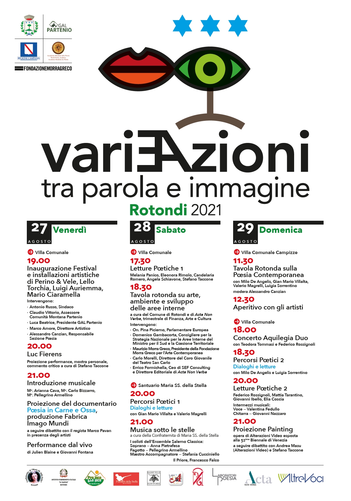 Dal 27 al 29 agosto la prima edizione di Vari∃Azioni, l’iniziativa promossa dall’amministrazione comunale di Rotondi, sindaco Antonio Russo, in collaborazione con la cooperativa Altre Voci e la Samuele Editore e con il patrocinio dell’Accademia Mondiale della Poesia e della Fondazione Greco Morra per l’Arte Contemporanea. E per la direzione artistica di Marco Amore e per la parte poetica di Alessandro Canzian.