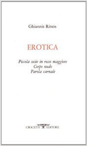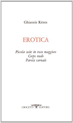 La sezione Corpo nudo in Erotica di Ritsos (la raccolta contiene anche Piccola suite in rosso maggiore e Parola carnale) è insuperabile, indigeribile, è una serie purtroppo finita di colpi di lirismo brevi e intensissimi. I versi, spesso ridotti a singole parole, sono crudi, fatti di lessico semplice e quotidiano, che nella sfera sensoriale dell’erotismo assumono una forza carnale e disperata. C’è un corpo lontano dall’io del poeta che un tempo si è lasciato sfiorare con tenerezza e possedere con bramosia e c’è un’assenza insopportabile senza la quale l’arte non sarebbe nata e la vita sarebbe continuata. I versi di Ritsos sono pieni del corpo amato, solido, tangibile ma non delineato da tratti caratterizzanti. È sicuramente di donna ma non femminino, fatto di piedi, ginocchia, unghie, capelli. Sembra un corpo fatto a pezzi dal dolore del poeta, i cui brandelli sono per lui ossessivamente presenti. Al contrario non si costituisce mai l’immagine di una figura intera perché, per quanto sentita come reale e carnale, non si concretizza nell’oggi del poeta.