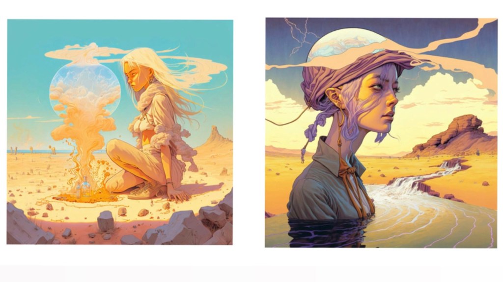 Tutte le immagini sono prodotte da Midjourney Inc, inscrivendo nel prompt il nome di Moebius(Jean Giraud) e Salvador Dalì. Behemoth è un animale mitologico ma in questo caso si riferisce all’opera di Kaito Basile.