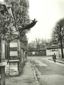 Questo volo, o questo salto nel vuoto, immagine kierkegaardianamente della fede, stabilisce un’altra coincidenza, se si vuole, miracolosa, con i tentativi di volo (e di vuoto) di uno dei più grandi artisti del Novecento, Yves Klein. Questo non solo per la celebre performance, realizzata dalla palestra di Judo da lui abitualmente frequentata, e immortalata nella foto dell’illusione riuscita in cui sembra che l’artista, invece che cadere, stia invece assurdamente librandosi verso l’alto (Salto nel Vuoto, appunto, del 1959), e neanche dalla coincidenza quanto mai provvida del fatto che ora, abbattuto da tempo il palazzo, sorga al suo posto proprio una chiesa intitolata a Rita da Cascia.